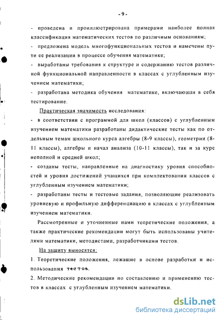 Гипотеза исследования: разработка тестов определенной направленности, структуры и содержания и их обоснованное использование на различных этапах процесса обучения математике в классах с углубленным изучением предмета может объективно выявить уровень способностей и достижений учащихся, интенсифицировать процесс обучения математике, способствовать обеспечению дифференциации обучения и повышению качества знаний школьников.