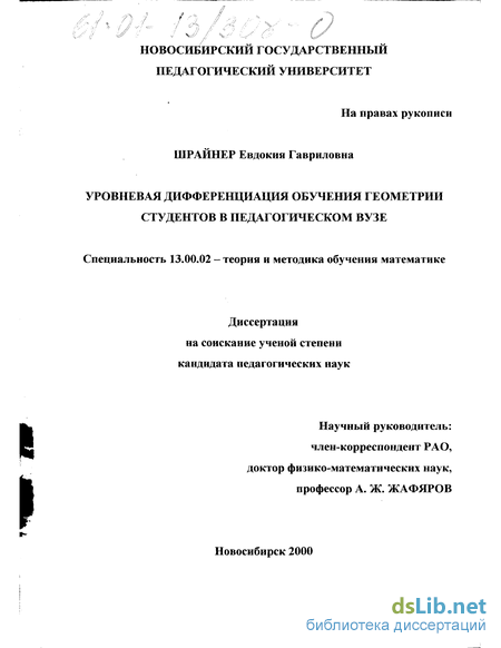 Выявить психолого-педагогические и дидактико-методические основы уровневой дифференциации обучения геометрии студентов в педвузах.