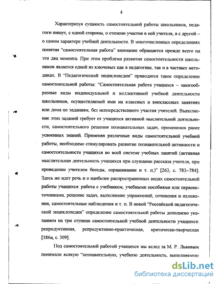 Характеризуя сущность самостоятельной работы школьников, педагоги пишут, с одной стороны, о степени участия в ней учителя, а с другой -о самом характере учебной деятельности. В многочисленных определениях понятия "самостоятельная работа" внимание обращается прежде всего на эти два момента. При этом проблема развития самостоятельности школьников является одной из ключевых как в педагогике, так и в частных методиках. В "Педагогической энциклопедии" приводится такое определение самостоятельной работы: "Самостоятельная работа учащихся - многообразные виды индивидуальной и коллективной учебной деятельности школьников, осуществляемой ими на классных и внеклассных занятиях или дома по заданиям, без непосредственного участия учителей. Выполнение этих заданий требует от учащихся активной мыслительной деятельности, самостоятельного решения познавательных задач, применения ранее усвоенных знаний. Применяя различные виды самостоятельной учебной работы, необходимо стимулировать развитие познавательной активности и самостоятельности учащихся во всей системе учебных занятий (активная мыслительная деятельность учащихся при слушании рассказа учителя, при проведении учителем беседы, спрашивании и т. п.)" [263, с. 783-784]. Здесь же идет речь и о наиболее распространенных видах самостоятельной работы учащихся: работа с учебником, учебными пособиями или первоисточниками, решение задач, выполнение упражнений, сочинения и изложения, самостоятельные наблюдения и т. п. В новой "Российской педагогической энциклопедии определение самостоятельной работы дополнено указанием на три ступени самостоятельной учебной деятельности учащихся: репродуктивная, репродуктивно-практическая, критически-творческая [186а, с. 309].