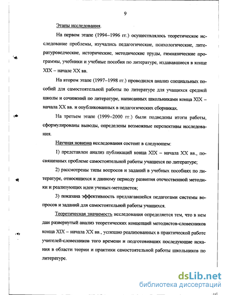 На втором этапе (1997-1998 гг.) проводился анализ специальных пособий для самостоятельной работы по литературе для учащихся средней школы и сочинений по литературе, написанных школьниками конца ХГХ -начала XX вв. и опубликованных в педагогических сборниках.
