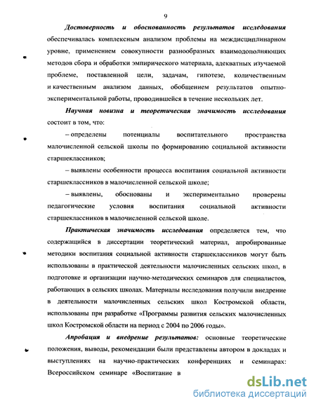 Апробация и внедрение результатов: основные теоретические положения, выводы, рекомендации были представлены автором в докладах и выступлениях на научно-практических конференциях и семинарах: Всероссийском семинаре «Воспитание в сельской школе» (г. Кострома,