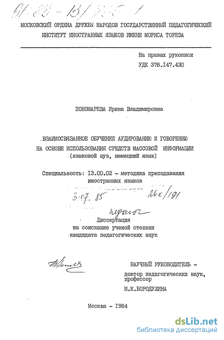Настоящая диссертация посвящена проблеме взаимосвязанного обучения аудированию и говорению на занятиях по общественно-политической тематике на старших семестрах языкового вуза на основе использования средств массовой информации (радио и телевидения).