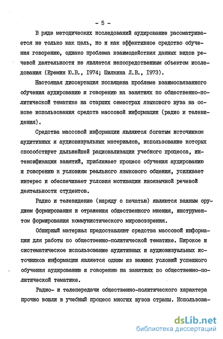 Необходимо отметить, что в настоящее время преподаватели языковых вузов имеют в своем распоряжении учебные материалы и серии упражнений для обучения отдельным видам речевой деятельности на основе использования материалов прессы, радио, кинофильмов и телевидения. Однако, несмотря на наличие учебных материалов и сравнительно большое количество публикаций (в основном - статей в научно-методических журналах), фактически нет исследований, посвященных проблеме взаимосвязанного обучения двум видам речевой деятельности - аудированию и говорению - на основе использования оригинальных радио- и телепередач по общественно-политической тематике.