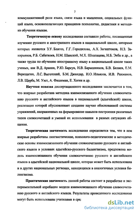 Научная новизна диссертационного исследования заключается в том, что впервые разработана методика взаимосвязанного обучения словосочетанию русского и английского языков в национальной (адыгейской) школе, реализация которой обусловливает создание научно обоснованной системы упражнений, направленных на формирование навыков построения различных типов словосочетаний и умений их использования в разных ситуациях общения.