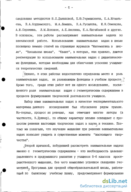 Однако, в этих работах недостаточно определены место и роль занимательных задач, их развивающим функциям в учебном процессе,? Кроме того, среди этих работ нет ни одного исследования, посвя- щенного роли занимательных задач с геометрическим содержанием в процессе формирования творческой деятельности учащихся.