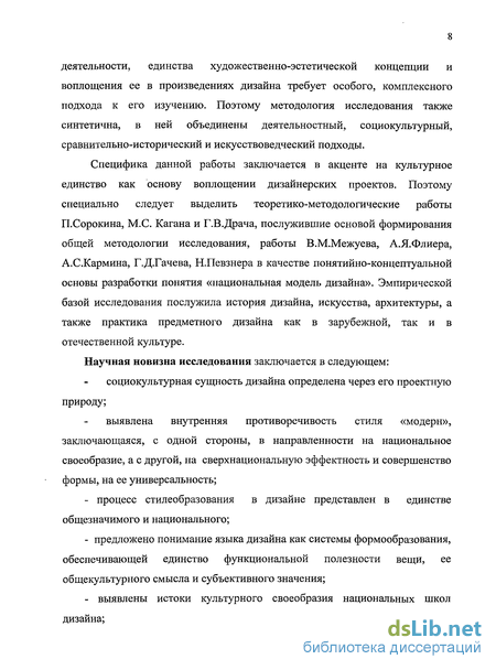 Специфика данной работы заключается в акценте на культурное единство как основу воплощении дизайнерских проектов. Поэтому специально следует выделить теоретико-методологические работы П.Сорокина, М.С. Кагана и Г.В.Драча, послужившие основой формирования общей методологии исследования, работы В.М.Межуева, А.Я.Флиера, А.С.Кармина, Г.Д.Гачева, Н.Певзнера в качестве понятийно-концептуальной основы разработки понятия «национальная модель дизайна». Эмпирической базой исследования послужила история дизайна, искусства, архитектуры, а также практика предметного дизайна как в зарубежной, так и в отечественной культуре.