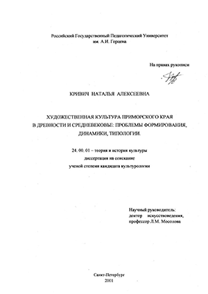 Кривич Наталья Алексеевна. Художественная культура Приморского края в древности и средневековье : Проблемы формирования, динамики, типологии : диссертация ... кандидата культурол. наук : 24.00.01.- Санкт-Петербург, 2001.- 216 с.: ил. РГБ ОД, 61 02-24/20-1