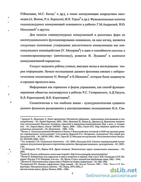 Для анализа социокультурных коммуникаций и различных форм их институционального функционирования основными, на наш взгляд, являются следующие положения: утверждение диалогичности коммуникации как кон-сенсуального взаимодействия (У. Матурана4) и идея о способности системы к «самовоспроизводству» (автопоэзису), развитая Н. Луманом5 в контексте коммуникативной парадигмы.