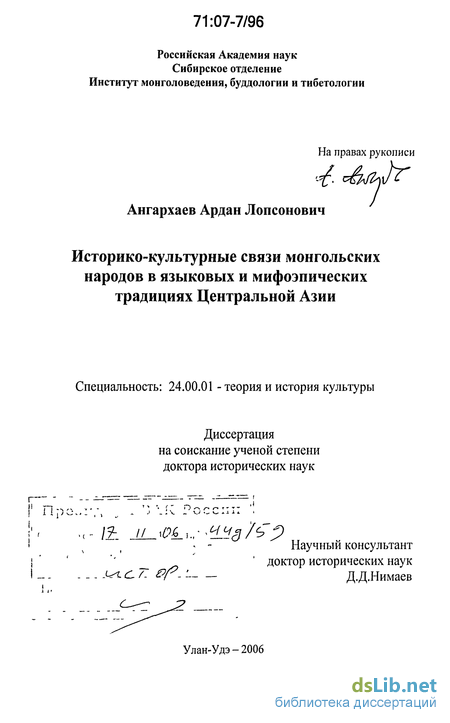 Объект исследования - историко-культурные связи монгольских народов в языковых, мифоэпических традициях Центральной Азии.