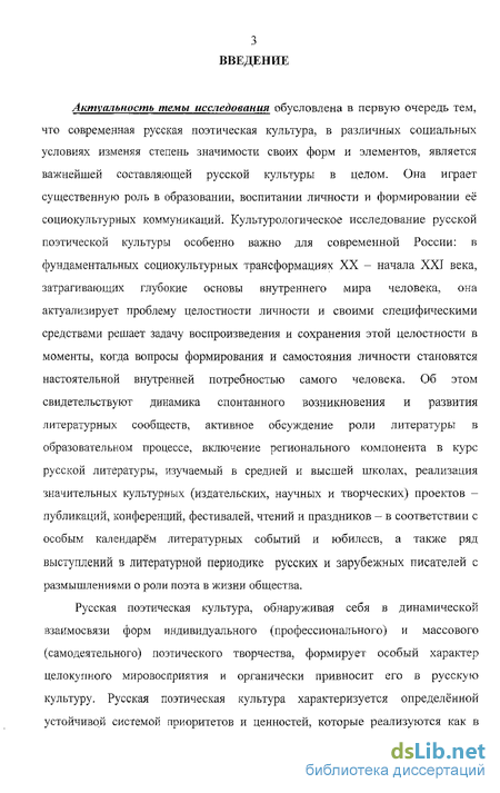 Актуальность темы исследования обусловлена в первую очередь тем, что современная русская поэтическая культура, в различных социальных условиях изменяя степень значимости своих форм и элементов, является важнейшей составляющей русской культуры в целом. Она играет существенную роль в образовании, воспитании личности и формировании её социокультурных коммуникаций. Культурологическое исследование русской поэтической культуры особенно важно для современной России: в фундаментальных социокультурных трансформациях XX - начала XXI века, затрагивающих глубокие основы внутреннего мира человека, она актуализирует проблему целостности личности и своими специфическими средствами решает задачу воспроизведения и сохранения этой целостности в моменты, когда вопросы формирования и самостояния личности становятся настоятельной внутренней потребностью самого человека. Об этом свидетельствуют динамика спонтанного возникновения и развития литературных сообществ, активное обсуждение роли литературы в образовательном процессе, включение регионального компонента в курс русской литературы, изучаемый в средней и высшей школах, реализация значительных культурных (издательских, научных и творческих) проектов -публикаций, конференций, фестивалей, чтений и праздников - в соответствии с особым календарём литературных событий и юбилеев, а также ряд выступлений в литературной периодике русских и зарубежных писателей с размышлениями о роли поэта в жизни общества.
