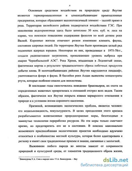 Для большинства якутов, экологические проблемы сегодня являются весьма болезненными. Экологические традиции, передающиеся от поколения к поколению как норма поведения, как высший закон уже не соблюдаются. Несмотря на официальное принятие православия, якуты вплоть до послереволюционного атеистического террора еще сохраняли свою богатую традиционную культуру, языческую религию, в которой добро было единственной творческой созидательной силой, а зло считалось способным только к разрушению215. В последнее время нарушение традиционных заповедей одновременно разрушает нравственные нормы, исполнение обычаев предков - служению добру, что заметно повлияло и на окружающую среду. На нынешнем этапе развития национальная культура пытается получить подлинно самобытное содержание и форму, встает на путь действительного возрождения и развития. Разумеется, здесь еще много нерешенных вопросов и проблем.