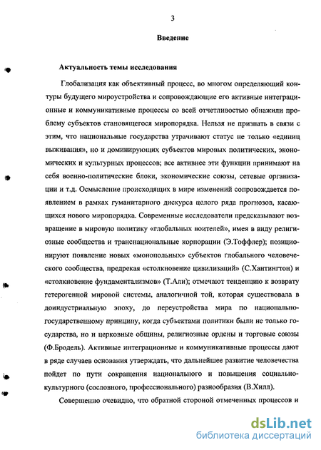 Глобализация как объективный процесс, во многом определяющий контуры будущего мироустройства и сопровождающие его активные интеграционные и коммуникативные процессы со всей отчетливостью обнажили проблему субъектов становящегося миропорядка. Нельзя не признать в связи с этим, что национальные государства утрачивают статус не только «единиц выживания», но и доминирующих субъектов мировых политических, экономических и культурных процессов; все активнее эти функции принимают на себя военно-политические блоки, экономические союзы, сетевые организации и т.д. Осмысление происходящих в мире изменений сопровождается появлением в рамках гуманитарного дискурса целого ряда прогнозов, касающихся нового миропорядка. Современные исследователи предсказывают возвращение в мировую политику «глобальных воителей», имея в виду религиозные сообщества и транснациональные корпорации (Э.Тоффлер); позиционируют появление новых «монопольных» субъектов глобального человеческого сообщества, предрекая «столкновение цивилизаций» (С.Хантингтон) и «столкновение фундаментализмов» (Т.Али); отмечают тенденцию к возврату гетерогенной мировой системы, аналогичной той, которая существовала в доиндустриальную эпоху, до переустройства мира по национально-государственному принципу, когда субъектами политики были не только государства, но и церковные общины, религиозные ордены и торговые союзы (Ф.Бродель). Активные интеграционные и коммуникативные процессы дают в ряде случаев основания утверждать, что дальнейшее развитие человечества пойдет по пути сокращения национального и повышения социально-культурного (сословного, профессионального) разнообразия (В.Хилл).