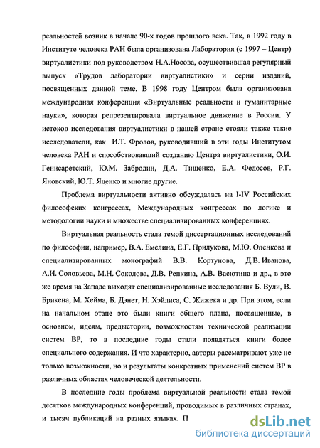 Виртуальная реальность стала темой диссертационных исследований по философии, например, В.А. Емелина, Е.Г. Прилукова, М.Ю. Опенкова и специализированных монографий В.В. Кортунова, Д.В. Иванова, А.И. Соловьева, М.Н. Соколова, Д.В. Репкина, А.В. Васютина и др., в это же время на Западе выходят специализированные исследования Б. Вули, В. Брикена, М. Хейма, Б. Дэнет, Н. Хэйлиса, С. Жижека и др. При этом, если на начальном этапе это были книги общего плана, посвященные, в основном, идеям, предыстории, возможностям технической реализации систем ВР, то в последние годы стали появляться книги более специального содержания. И что характерно, авторы рассматривают уже не только возможности, но и результаты конкретных применений систем ВР в различных областях человеческой деятельности.