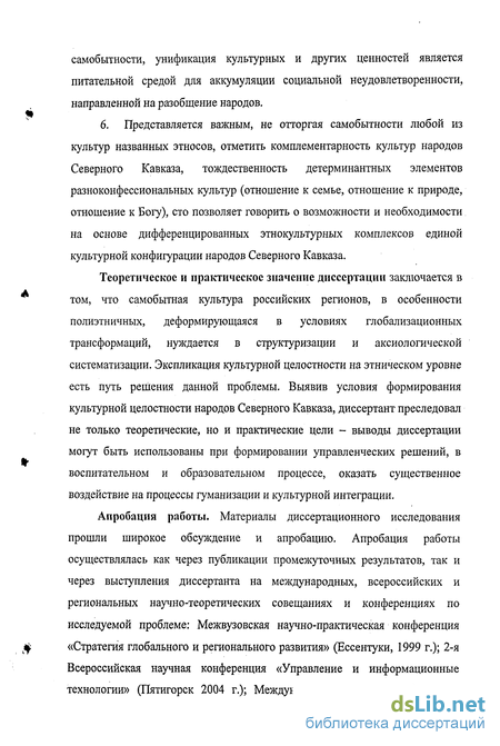 Теоретическое и практическое значение диссертации заключается в том, что самобытная культура российских регионов, в особенности полиэтничных, деформирующаяся в условиях глобализационных трансформаций, нуждается в структуризации и аксиологической систематизации. Экспликация культурной целостности на этническом уровне есть путь решения данной проблемы. Выявив условия формирования культурной целостности народов Северного Кавказа, диссертант преследовал не только теоретические, но и практические цели - выводы диссертации могут быть использованы при формировании управленческих решений, в воспитательном и образовательном процессе, оказать существенное воздействие на процессы гуманизации и культурной интеграции.