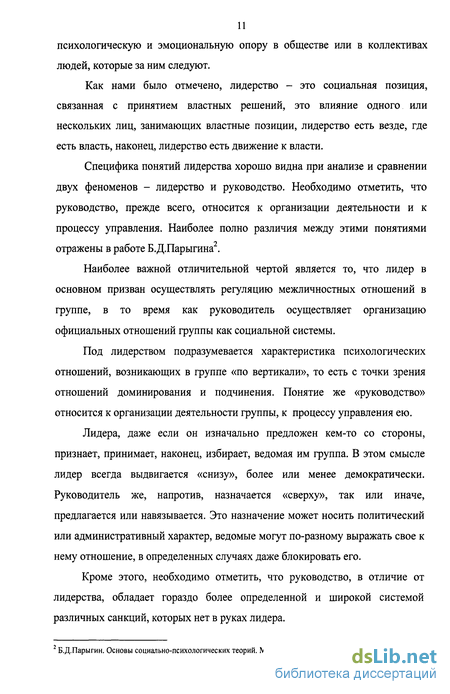 Специфика понятий лидерства хорошо видна при анализе и сравнении двух феноменов - лидерство и руководство. Необходимо отметить, что руководство, прежде всего, относится к организации деятельности и к процессу управления. Наиболее полно различия между этими понятиями отражены в работе Б.Д.Парыгина .