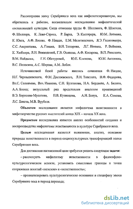 Предметом исследования является анализ особенностей создания и воспроизводства мифологемы женственности в культуре Серебряного века.