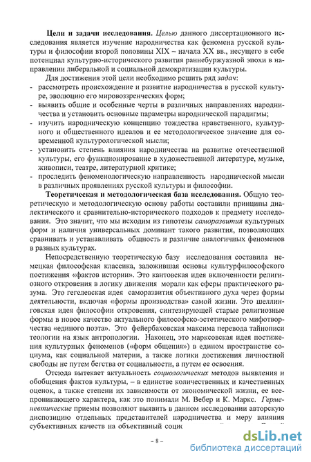 Отсюда вытекает актуальность социологических методов выявления и обобщения фактов культуры, - в единстве количественных и качественных оценок, а также степени их зависимости от экономической жизни, ее всепроникающего характера, как это понимали М. Вебер и К. Маркс. Герменевтические приемы позволяют выявить в данном исследовании авторскую диспозицию отдельных представителей народничества и меру влияния субъективных качеств на объективный социокультурный процесс. В этой связи особое внимание уделено экзистенциальным аспектам анализа жизни и творчества народников, степени их влияния на факты судьбы. Феноменологический подход позволяет улавливать смысловые тональности народнической парадигмы даже там, где находится, казалось бы, противоположный народничеству лагерь русской культуры - «государственный либерализм».