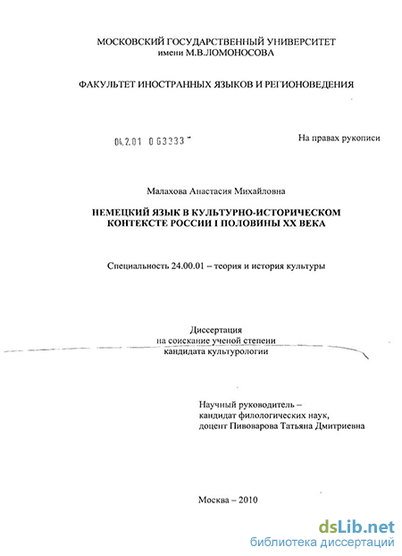 В связи с междисциплинарным характером исследования методологической основой диссертации послужили культурно- лингвистический, историко-культурологический и сравнительно-исторический методы, подразумевающие комплексный подход к изучаемым явлениям. Культурно-лингвистический метод был использован автором при формулировке определения понятия «культурно-исторический контекст». С помощью историко-культурологического метода была дана характеристика культурно-исторического контекста России первой половины ХХ века. Сравнительно-исторический метод позволил путем сравнения особенностей культурного поля царской и советской России выявить общее и различия в месте и роли немецкого языка в культурно-историческом контексте России в разные периоды в рамках первой половины ХХ века.