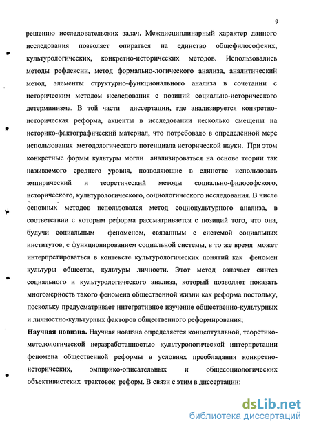 Общими методологическими принципами исследования являются принципы историзма, детерминизма и системности. В качестве теоретико-методологической основы диссертации выступают культурологические теории зарубежных и отечественных учёных, и, в первую очередь, философов-культурологов, представляющих ростовскую школу культурологии, в рамках которой общественные феномены исследуются в контексте проблем общей теории культуры. При этом наибольший научный интерес для нас представляют исследования таких известных отечественных культурологов, как Б. С. Ерасов, А. Н. Ерыгин, Ю. А. Жданов, В.Е. Давидович, Г. В. Драч, Э. С. Маркарян, В. М. Межуев, Э. А. Орлова, Э. В. Соколов, А. Я. Флиер, О. М. Штомпель и др.. Работа выполнена в русле таких взаимодополняющих теоретико-культурологических подходов в изучении явлений общественной жизни как деятельностный и аксиологический. С учётом междисциплинарного характера реформы как объекта научного познания обращалось внимание на те теоретические социально-философские, социологические, исторические интерпретации реформы, которые могли, так или иначе, способствовать