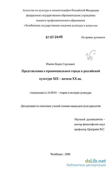 5 ре России. Отсутствие продуктивных методов анализа; непроясненность категориального аппарата, используемого в работе; сосредоточенность либо на узких эпизодах истории представлений, либо на недостаточно обоснованных широкомасштабных обобщениях, не учитывающих естественной множественности и историчности представлений, тормозят процесс создания адекватной историографии образа провинциального города в контексте российской культуры. Таким образом, проблема настоящего исследования может быть сформулирована в виде противоречия между достаточно высоким уровнем развития методологии исследования форм знаний о мире в культуре и отсутствием ее спецификации в отношении представлений о провинциальном городе в российской культуре, имеющим своим следствием схематизм в реконструкции их истории.