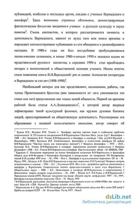 публикаций, особенно в последнее время, связано с учением Вернадского о ноосфере1. Здесь возможны странные сближенья, демонстрирующие фантастическое боїаіство введенною ученым в русскую культуру и науку понятия". Смена контекстов, в которых рассматривается личность и деятельность Вернадского, зависит оі нужд того или иною времени и порождает соответствующие публикации из его обширною и разнообразного наследия. В 1980-е юды он был восіребован пробуждающимся экологическим сознанием, в конце 1980-х-начале 1990-х оказался одним из представителей русскою космизма, в середине 1990-х стал преобладать интерес к политической и общественной позиции ученого. Неким итогом стало появление книіи В.И.Вернадский: pro et contra: Антология литературы о Вернадском за сто лет (1898-1998)3.