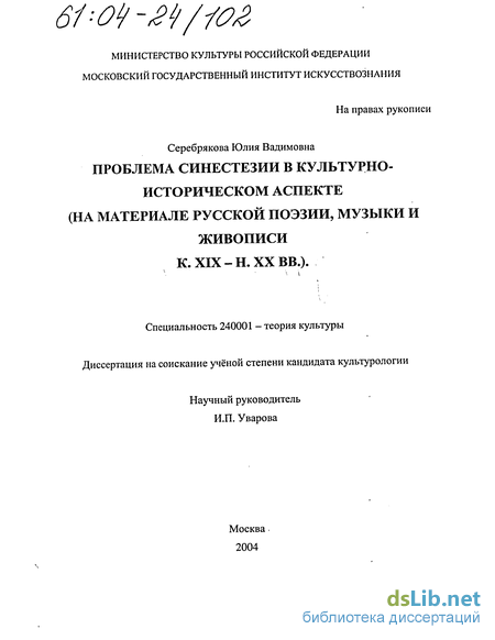 В 1930-е г.г. область исследования полимодальности человеческого восприятия переместилась из искусства в науку, а точнее, ряд наук. Это литературоведение (интересна с этой точки зрения работа О. М. Фрейденберг «Поэтика сюжета и жанра», в которой последовательно проведена мысль о взаимосвязи генезиса искусства и мышления, а именно одновременного появления словесного искусства и логического мышления). Это медицина, изучающая возможности головного мозга человека. Это психология, лингвистика, а затем и психолингвистика (В. В. Левицкий, И. Н. Горелов, А. П. Журавлев, С. В. Воронин, И. Р. Гальперин и мн. др.). Состояние разработки проблемы цветовой символики звука (Г. Н. Иванова-Лукьянова, 1966; А. П. Журавлев, 1974; Ю. А. Тамбовцев, 1981; Е. Г. Сомова, 1982, Л. П. Прокофьева, 1998) подготовило следующий этап в ее изучении -системное описание всех составляющих компонентов и отражение в поэтическом, музыкальном, художественном идеостилях особенностей проявления данной разновидности звукового символизма. Необходимость дальнейшего развития идей эстетической и стилистической релевантности ЦСЗ в стихотворном тексте, музыке и живописи, изучение данного явления в плане синестезической обусловленности языкового знака, а также особенности восприятия ЦСЗ реципиентами как начала 20 века, так и начала 21 века, определяет АКТУАЛЬНОСТЬ избранной темы исследования. ЦЕЛЬ работы - изучить функционирование ЦСЗ в музыкальных и художественных формах, поэтическом тексте, выявить своеобразие ее проявления в идеостилях, объяснить стилистическую релевантность и полисемантичность цвето-звуковых ассоциаций в их эстетической и коммуникативной функциях, изучить восприятие ЦСЗ реципиентами разных поколений.