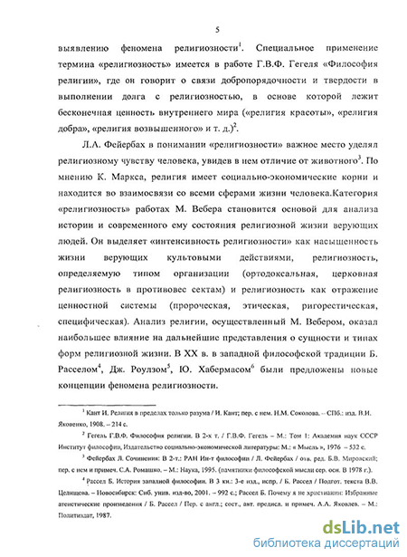 Категория «религиозность» работах М. Вебера становится основой для анализа истории и современного ему состояния религиозной жизни верующих людей. Он выделяет «интенсивность религиозности» как насыщенность жизни верующих культовыми действиями, религиозность, определяемую типом организации (ортодоксальная, церковная религиозность в противовес сектам) и религиозность как отражение ценностной системы (пророческая, этическая, ригорестическая, специфическая). Анализ религии, осуществленный М. Вебе-ром, оказал наибольшее влияние на дальнейшие представления о сущности и типах форм религиозной жизни. В XX в. в западной философской традиции Б. Расселом, Дж. Роулзом, Ю. Хабермасом были предложены новые концепции феномена религиозности.