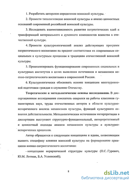 В.Ю. Микрюковым, Е.Г. Радионовым, Н.С. Рейнгардт, М.И. Рожковым, Н.А. Савотиной. Специфику военно-патриотического воспитания раскрывают П.Ф. Агинов, В.Н. Гребеньков, М.Б. Кусмарцев, Т.С. Колябина, В.И. Лутовинов, В.К. Новик, А.И. Пятикоп. Однако необходимо отметить, что в работах данных авторов военно-патриотическое воспитание лишь номинально связано с общим культурным развитием. Необходимость ориентации военно-патриотического воспитания на культурные традиции в целом лишь констатируется, но не получает должной теоретической разработки.