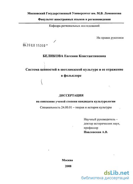 В качестве конкретного материала исследования в диссертации выбрана система ценностей в шотландской культуре. Выбор темы и материала исследования, прежде всего, вызваны актуальностью изучения особенностей, традиций и ценностей различных регионов и народов мира в связи с важностью проблемы межкультурного диалога в современном мире, а также малоизученностыо этого вопроса, как в отечественной, так и зарубежной культурологии.