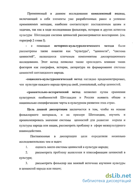 включающий в себя элементы уже разработанных ранее и успешно применяемых методик, наиболее соответствует поставленным целям и задачам, так как в ходе исследования фольклора, истории и других аспектов культуры Шотландии система ценностей рассматривается всесторонне, (см. параграф 2 глава I).