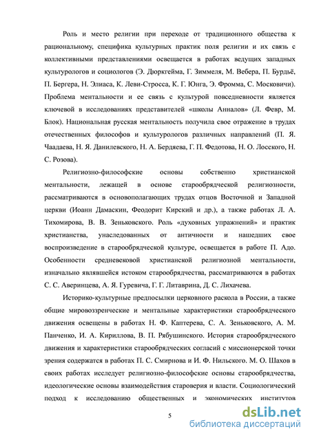 При рассмотрении вопроса трансформации старообрядческой ментальности важнейшей задачей является определение сущности взаимодействия ментальных характеристик и религиозной традиции. В настоящем параграфе эта задача решается путем анализа основных исследовательских подходов в определении характера религиозной ментальности в контексте исследуемой нами проблематики старообрядческой религиозности. Это касается, прежде всего, соотношения таких понятий, как «ментальность» и «религия», влияние религиозной ментальности на формирование культурной идентичности, состав и характер культурных практик, взаимосвязь религии и национальных ментальных констант.