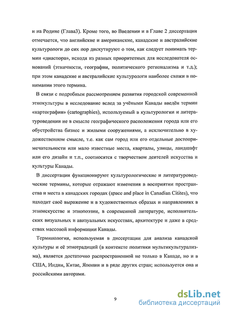 и на Родине (ГлаваЗ). Кроме того, во Введении и в Главе 2 диссертации отмечается, что английские и американские, канадские и австралийские культурологи до сих пор дискутируют о том, как следует понимать термин «диаспора», исходя из разных приоритетных для исследователя оснований (этничности, географии, политического регионализма и т.д.); при этом канадские и австралийские культурологи наиболее схожи в понимании этого термина.