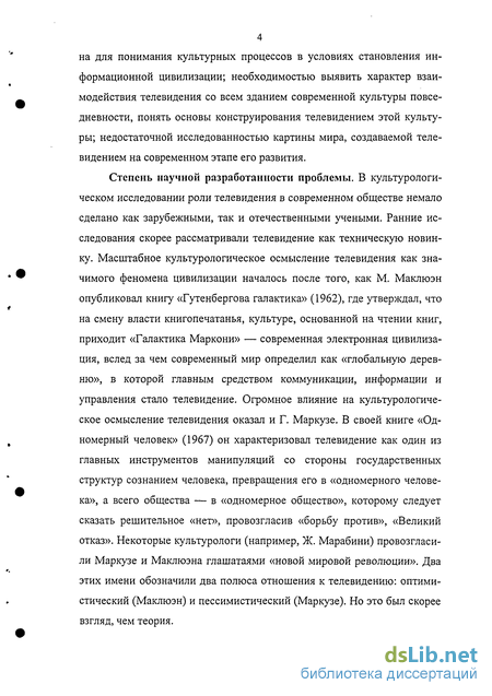 Степень научной разработанности проблемы. В культурологическом исследовании роли телевидения в современном обществе немало сделано как зарубежными, так и отечественными учеными. Ранние исследования скорее рассматривали телевидение как техническую новинку. Масштабное культурологическое осмысление телевидения как значимого феномена цивилизации началось после того, как М. Маклюэн опубликовал книгу «Гутенбергова галактика» (1962), где утверждал, что на смену власти книгопечатанья, культуре, основанной на чтении книг, приходит «Галактика Маркони» — современная электронная цивилизация, вслед за чем современный мир определил как «глобальную деревню», в которой главным средством коммуникации, информации и управления стало телевидение. Огромное влияние на культурологическое осмысление телевидения оказал и Г. Маркузе. В своей книге «Одномерный человек» (1967) он характеризовал телевидение как один из главных инструментов манипуляций со стороны государственных структур сознанием человека, превращения его в «одномерного человека», а всего общества — в «одномерное общество», которому следует сказать решительное «нет», провозгласив «борьбу против», «Великий отказ». Некоторые культурологи (например, Ж. Марабини) провозгласили Маркузе и Маклюэна глашатаями «новой мировой революции». Два этих имени обозначили два полюса отношения к телевидению: оптимистический (Маклюэн) и пессимистический (Маркузе). Но это был скорее взгляд, чем теория.