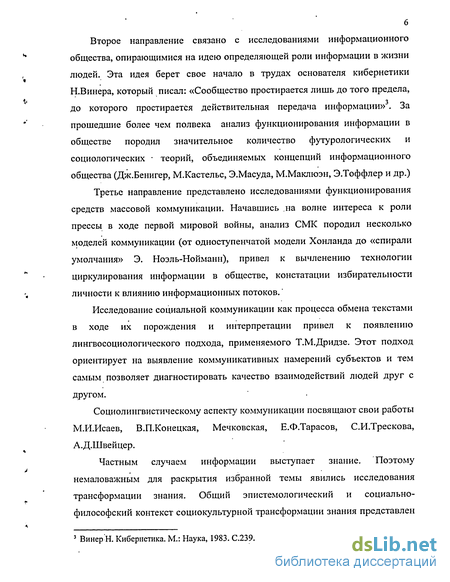 Второе направление связано с исследованиями информационного общества, опирающимися на идею определяющей роли информации в жизни людей. Эта идея берет свое начало в трудах основателя кибернетики Н.Винера, который писал: «Сообщество простирается лишь до того предела, до которого простирается действительная передача информации»3. За прошедшие более чем полвека анализ функционирования информации в обществе породил значительное количество футурологических и социологических теорий, объединяемых концепций информационного общества (Дж.Бенигер, М.Кастельс, Э.Масуда, М.Маклюэн, Э.Тоффлер и др.)