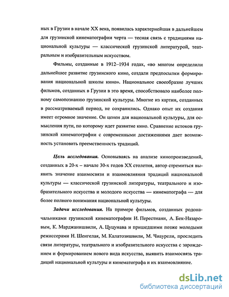 Взаимосвязь кинематографа с национальной культурой оказалась важнейшей не только для русского кинематографа, но и для кинематографии национальных республик. В этом отношении интересен опыт кинематографии Грузии, где на почве многовековой культуры — классической литературы, театрального и изобразительного искусства, стало возможным появление нового вида искусства.