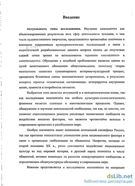 Актуальность темы исследования. Изучение менталитета как объективированных результатов всех сфер деятельности человека, в том числе художественного творчества, представляется чрезвычайно значимым в контексте современных культурологических исследований в связи с недостаточной разработанностью данного вопроса вплоть до отсутствия единой точки зрения на использование терминов «менталитет» и «ментальность». Обращение к подобной проблематике является одним из путей качественного обновления обществоведения, поскольку теория менталитета позволяет гуманизировать историко-культурный процесс, преодолеть безличные схемы экономического детерминизма, в результате которого теряется человеческая составляющая, игнорируется внутренняя жизнь, ценности и потребности личности.