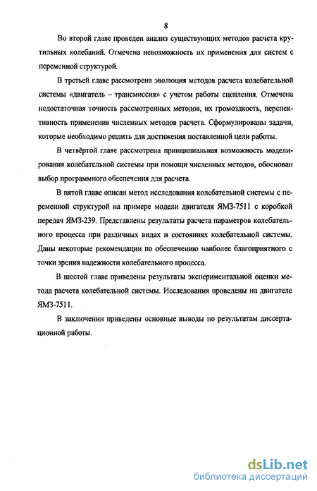 В пятой главе описан метод исследования колебательной системы с переменной структурой на примере модели двигателя ЯМЗ-7511 с коробкой передач ЯМЗ-239. Представлены результаты расчета параметров колебательного процесса при различных видах и состояниях колебательной системы. Даны некоторые рекомендации по обеспечению наиболее благоприятного с точки зрения надежности колебательного процесса.