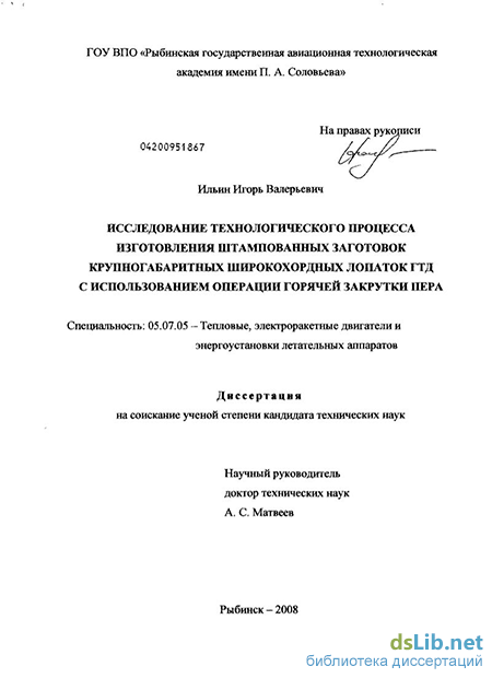 Реализация работы. Теоретические исследования по определению силовых параметров процесса горячей закрутки стержней с сечениями аэродинамического профиля, переменными по длине, использованы при проектировании установок для реализации процесса горячей закрутки профиля пера лопаток ГТД на ОАО «НПО «Сатурн». Отдельные результаты исследований использованы в учебном процессе при подготовке бакалавров по направлению 150400 «Технологические машины и оборудование» и инженеров, обучающихся по направлению 651400 «Машиностроительные технологии и оборудование» специальности 120400 «Машины и технология обработки металлов давлением» и включены в разделы лекционных курсов «Ковка и объемная штамповка», «Технология обработки авиационных материалов», «Специальные способы штамповки авиационных материалов».