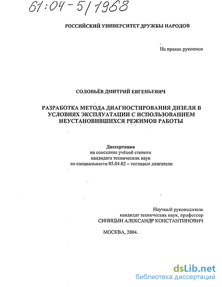 В настоящей работе проведена разработка метода, способа (т. е. в конечном итоге алгоритма и программы) проведения процедур диагностирования дизеля, позволяющих в результате получить данные о протекании внешней скоростной характеристики дизеля, как наиболее полной информации о его техническом состоянии. Разработанный способ учитывает особенности рабочих процессов в системах дизеля при неустановившихся режимах работы, что позволяет сравнивать полученные результаты с эталонными, полученными в заводских условиях, на испытательных стендах при установившихся режимах.