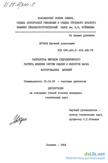 Работа выполнялась в соответствии с планом ОКиНИР Коломенского тепловозостроительного завода им. В.В.Куйбышева по теме 460201.78.81.1.008 "Научно-исследовательские и опытно-конструкторские работы по доводке систем смазки тепловозных двигателей и их узлов".