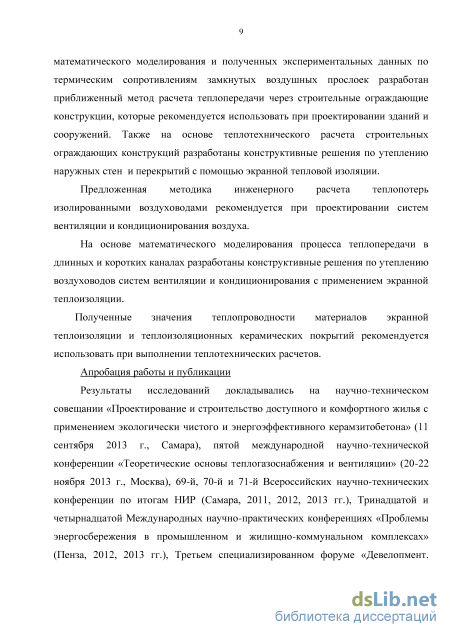 Апробация работы и публикации. Результаты исследований докладывались на научно-техническом совещании «Проектирование и строительство доступного и комфортного жилья с применением экологически чистого и энергоэффективного керамзитобетона» (11 сентября 2013 г., Самара), пятой международной научно-технической конференции «Теоретические основы теплогазоснабжения и вентиляции» (20-22 ноября 2013 г., Москва), 69-й, 70-й и 71-й Всероссийских научно-технических конференции по итогам НИР (Самара, 2011, 2012, 2013 гг.), Тринадцатой и четырнадцатой Международных научно-практических конференциях «Проблемы энергосбережения в промышленном и жилищно-коммунальном комплексах» (Пенза, 2012, 2013 гг.), Третьем специализированном форуме «Девелопмент. Строительство. Ресурсосбережение» в рамках программы «Энергосбережение в строительстве и ЖКХ» (Тольятти, 2014 г.).