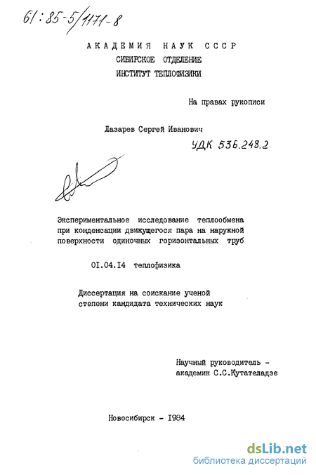 Под руководством И.И.Гогонина в институте теплофизики СО АН СССР был проведен цикл работ по исследованию теплообмена при пленочной конденсации движущихся чистых паров на наружной поверхности горизонтальных труб _9, 20, 43-48J.