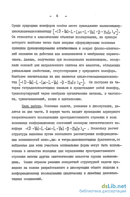 Цель работы. Основные задачи, решаемые в диссертации, делятся на две части. В первую часть входит проведение априорного теоретического исследования пространственного строения и всех возможных конформационных состояний молекулы синтетического ионофора -(Б -Yal-L -Lac-L -Val -D -Hylv 4- поскольку расчет структуры выполнен путем поэтапного рассмотрения конформационных возможностей моно-,ди- и тетра-депсипептидных фрагментов,то найденные для этих участков оптимальные формы могут быть использованы в качестве исходных для определения пространственного строения многих других синтетических аналогов группы валиномицина. Таким образом решение конкретной структурной задачи проведено на основе разработанного в диссертации общего подхода к конформационному исследованию циклических и линейных депсипеп-тидных соединений.