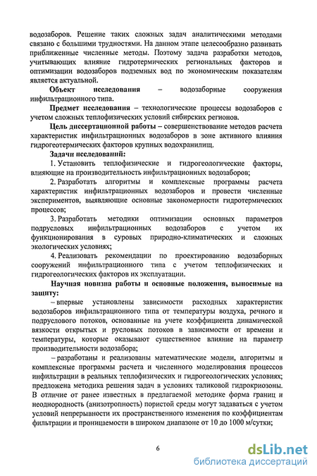 Цель диссертационной работы - совершенствование методов расчета характеристик инфильтрационных водозаборов в зоне активного влияния гидрогеотермических факторов крупных водохранилищ.