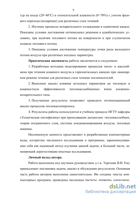 Работа выполнена под научным руководством д.т.н. Терехова В.И. Ему принадлежит постановка задачи, анализ и обсуждение результатов. К.т.н. Горбачев М.В. являлся научным консультантом по данной работе. Им проделана отладка программного комплекса и анализ циклов испарительного охлаждения. Основная часть работы автором выполнена самостоятельно. Им созданы тексты компьютерных программ, проведено тестирование и оценка адекватности, численные расчеты, обработка результатов и подготовка материалов к публикации. Все результаты, имеющие научную новизну и выносимые на защиту, получены автором лично.