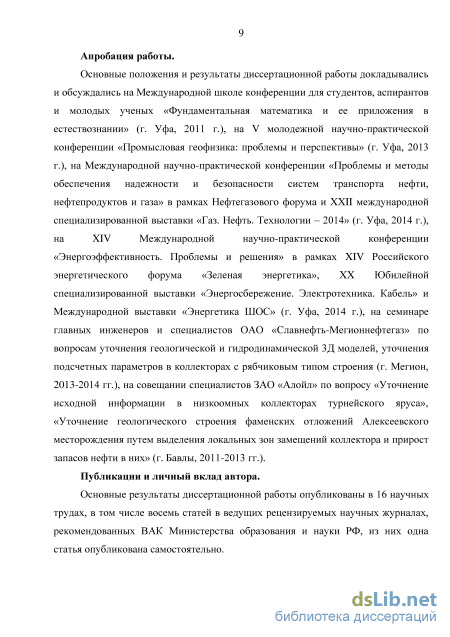 Основные положения и результаты диссертационной работы докладывались и обсуждались на Международной школе конференции для студентов, аспирантов и молодых ученых «Фундаментальная математика и ее приложения в естествознании» (г. Уфа, 2011 г.), на V молодежной научно-практической конференции «Промысловая геофизика: проблемы и перспективы» (г. Уфа, 2013 г.), на Международной научно-практической конференции «Проблемы и методы обеспечения надежности и безопасности систем транспорта нефти, нефтепродуктов и газа» в рамках Нефтегазового форума и XXII международной специализированной выставки «Газ. Нефть. Технологии - 2014» (г. Уфа, 2014 г.), на XIV Международной научно-практической конференции «Энергоэффективность. Проблемы и решения» в рамках XIV Российского энергетического форума «Зеленая энергетика», XX Юбилейной специализированной выставки «Энергосбережение. Электротехника. Кабель» и Международной выставки «Энергетика ШОС» (г. Уфа, 2014 г.), на семинаре главных инженеров и специалистов ОАО «Славнефть-Мегионнефтегаз» по вопросам уточнения геологической и гидродинамической ЗД моделей, уточнения подсчетных параметров в коллекторах с рябчиковым типом строения (г. Мегион, 2013-2014 гг.).