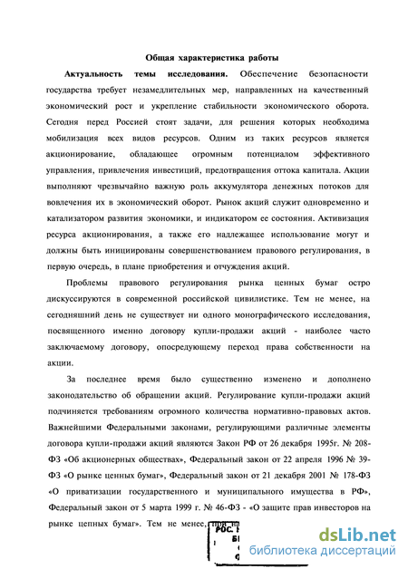 Общая характеристика работы Актуальность темы исследования. Обеспечение безопасности государства требует незамедлительных мер, направленных на качественный экономический рост и укрепление стабильности экономического оборота. Сегодня перед Россией стоят задачи, для решения которых необходима мобилизация всех видов ресурсов. Одним из таких ресурсов является акционирование, обладающее огромным потенциалом эффективного управления, привлечения инвестиций, предотвращения оттока капитала. Акции выполняют чрезвычайно важную роль аккумулятора денежных потоков для вовлечения их в экономический оборот. Рынок акций служит одновременно и катализатором развития экономики, и индикатором ее состояния. Активизация ресурса акционирования, а также его надлежащее использование могут и должны быть инициированы совершенствованием правового регулирования, в первую очередь, в плане приобретения и отчуждения акций.