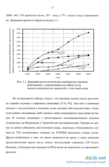 В начальный период разработки УГКНМ (1978-г1985гг.) осложнения практически не наблюдались. Они начали проявляться с 1990г. Так, в 1994г. 28 скважин выносили песок, 19 - пластовую воду. В 1995г. появились скважины, которые выносили одновременно песок и воду. В дальнейшем количество осложненных скважин возрастало почти монотонно и достигло к началу 2000г. 461: 195 выносили песок, 187 - воду, а 79 - песок и воду одновременно. Динамика процесса отражена на рис. 1.1.