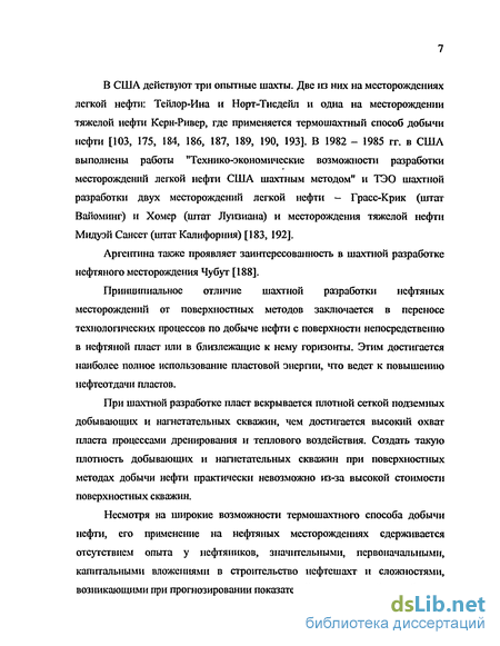 В США действуют три опытные шахты. Две из них на месторождениях легкой нефти: Тейлор-Ина и Норт-Тисдейл и одна на месторождении тяжелой нефти Керн-Ривер, где применяется термошахтный способ добычи нефти [103, 175, 184, 186, 187, 189, 190, 193]. В 1982 - 1985 гг. в США выполнены работы "Технико-экономические возможности разработки месторождений легкой нефти США шахтным методом" и ТЭО шахтной разработки двух месторождений легкой нефти - Грасс-Крик (штат Вайоминг) и Хомер (штат Луизиана) и месторождения тяжелой нефти Мидуэй Сансет (штат Калифорния) [183, 192].
