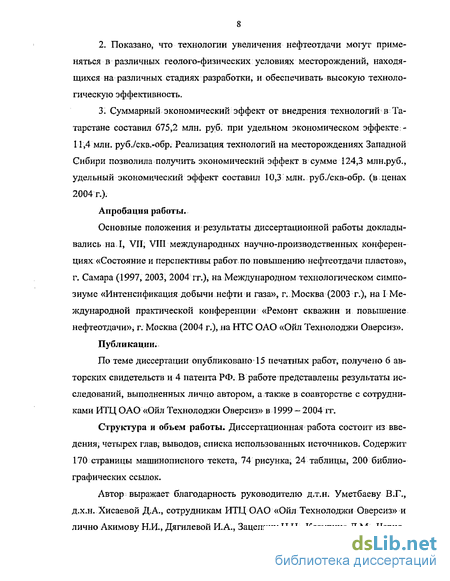 Суммарный экономический эффект от внедрения технологий в Татарстане составил 675,2 млн. руб. при удельном экономическом эффекте: -11,4 млн. руб./скв.-обр. Реализация технологий на месторождениях Западной Сибири позволила получить экономический эффект в сумме 124,3 млн.руб., удельный экономический эффект составил 10,3 млн. руб./скв-обр. (в ценах 2004г.).
